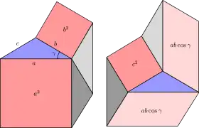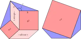 - in pink, the areas a2, b2, and −2ab cos γ on the left and c2 on the right;