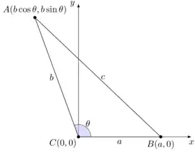 Consider a triangle with sides of length a, b, c, where θ is the measurement of the angle opposite the side of length c. This triangle can be placed on the Cartesian coordinate system with side a aligned along the x axis and angle θ placed at the origin, by plotting the components of the 3 points of the triangle as shown in Fig. 4: