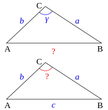 - the third side of a triangle if two sides and an angle opposite to one of them is known (this side can also be found by two applications of the law of sines):[lower-alpha 1]
