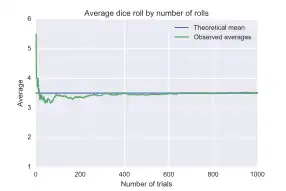 According to the law of large numbers, if a large number of six-sided dice are rolled, the average of their values (sometimes called the sample mean) will approach 3.5, with the precision increasing as more dice are rolled.