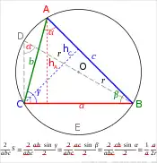 where is the radius of the circumscribing circle of the triangle.[9] Angles and lie on the same circle and subtend the same chord c; thus, by the inscribed angle theorem, . Therefore,