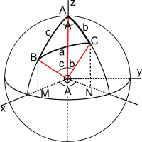 Consider a unit sphere with three unit vectors OA, OB and OC drawn from the origin to the vertices of the triangle. Thus the angles α, β, and γ are the angles a, b, and c, respectively. The arc BC subtends an angle of magnitude a at the centre. Introduce a Cartesian basis with OA along the z-axis and OB in the xz-plane making an angle c with the z-axis. The vector OC projects to ON in the xy-plane and the angle between ON and the x-axis is A. Therefore, the three vectors have components: