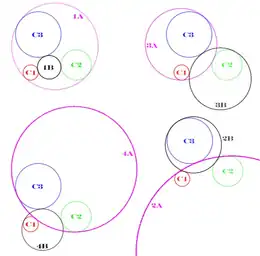 The eight solutions of the generic Apollonian problem. The three given circles are labeled C1, C2 and C3 and colored red, green and blue, respectively. The solutions are arranged in four pairs, with one pink and one black solution circle each, labeled as 1A/1B, 2A/2B, 3A/3B, and 4A/4B. Each pair makes oriented contact with C1, C2, and C3, for a suitable choice of orientations; there are four such choices up to an overall orientation reversal.