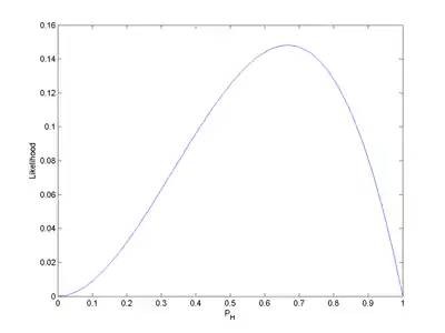 More generally, for each value of , we can calculate the corresponding likelihood. The result of such calculations is displayed in Figure 1. The integral of over [0, 1] is 1/3; likelihoods need not integrate or sum to one over the parameter space.