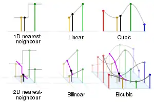 Black and red/yellow/green/blue dots correspond to the interpolated point and neighbouring samples, respectively.