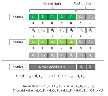 The sources and the intermediate nodes can combine any subset of the original and previously coded packets performing linear operations. To form a coded packet in RLNC, the original and previously coded packets are multiplied by randomly chosen coefficients and added together. Since each packet is just an appended set of Galois field elements, the operations of multiplication and addition are performed symbol-wise over each of the individual symbols of the packets, as shown in the picture from the example.