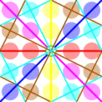 | One-dimensional subspaces in the two-dimensional vector space over the finite field F5. The origin (0, 0), marked with green circles, belongs to any of six 1-subspaces, while each of 24 remaining points belongs to exactly one; a property which holds for 1-subspaces over any field and in all dimensions. All F52 (i.e. a 5 × 5 square) is pictured four times for a better visualization |