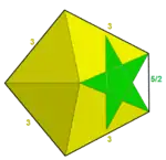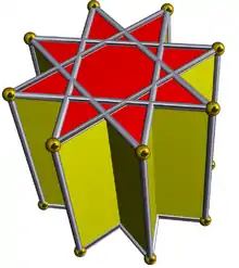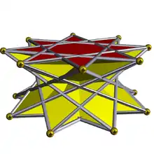 | Pentagrammic crossed-antiprism | ![]() | | 2 2 5/3 | ![]() 5/3.3.3.3 | D5d | C35a | — | U80a | K05a | 10 | 20 | 12 | 2 | Yes | 3 | 10{3}+2{5/2} |