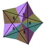 | Small stellated dodecahedron | ![]() | 5 | 2 5/2 | (5/2)5 | Ih | C43 | W020 | U34 | K39 | 12 | 30 | 12 | −6 | Yes | 3 | 12{5/2} |