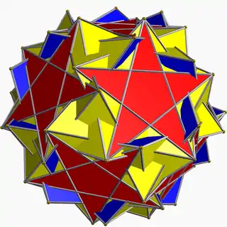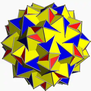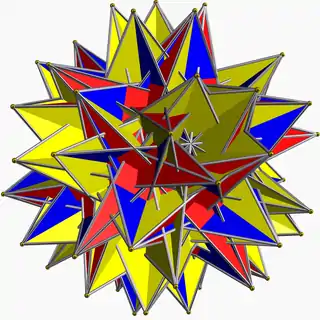 | Great icosahedron | ![]() | 5/2 | 2 3 | ![]() (3.3.3.3.3)/2 | Ih | C69 | W041 | U53 | K58 | 12 | 30 | 20 | 2 | Yes | 7 | 20{3} |