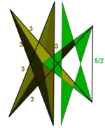 | Ditrigonal dodeca- dodecahedron | ![]() | 3 | 5/3 5 | (5/3.5)3 | Ih | C53 | W080 | U41 | K46 | 20 | 60 | 24 | −16 | Yes | 4 | 12{5}+12{5/2} |