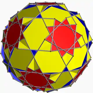 | Great icosidodecahedron | ![]() | 2 | 3 5/2 | ![]() (5/2.3)2 | Ih | C70 | W094 | U54 | K59 | 30 | 60 | 32 | 2 | Yes | 7 | 20{3}+12{5/2} |
