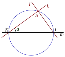 In the figure, the points K and L are fixed points on a given line m. The line k is a variable line through K. The line l through L is perpendicular to k. The angle between k and m is the parameter. k and l are associated lines depending on the common parameter. The variable intersection point S of k and l describes a circle. This circle is the locus of the intersection point of the two associated lines.