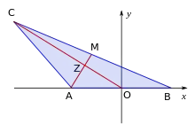 Choose an orthonormal coordinate system such that A(−c/2, 0), B(c/2, 0). C(x, y) is the variable third vertex. The center of [BC] is M((2x + c)/4, y/2). The median from C has a slope y/x. The median AM has slope 2y/(2x + 3c).