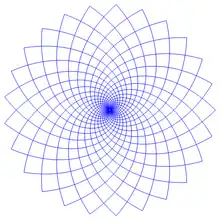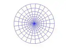 In order to solve a PDE numerically in a domain, a discrete coordinate system must be introduced in this domain. If the domain has rotational symmetry and you want a grid consisting of rectangles, polar coordinates are a poor choice, since in the center of the circle it gives rise to triangles rather than rectangles. However, this can be remedied by introducing log-polar coordinates in the following way. Divide the plane into a grid of squares with side length 2/n, where n is a positive integer. Use the complex exponential function to create a log-polar grid in the plane. The left half-plane is then mapped onto the unit disc, with the number of radii equal to n. It can be even more advantageous to instead map the diagonals in these squares, which gives a discrete coordinate system in the unit disc consisting of spirals, see the figure to the right.