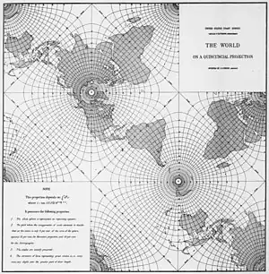 In 1879 Peirce developed Peirce quincuncial projection, having been inspired by H. A. Schwarz's 1869 conformal transformation of a circle onto a polygon of n sides (known as the Schwarz–Christoffel mapping).