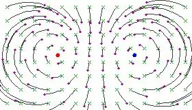 These pictures resemble the field lines of a positive and a negative electrical charge located at the fixed points, because the circular flow lines subtend a constant angle between the two fixed points.