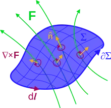 Surface Σ with closed boundary ∂Σ. F could be the E or B fields. Again, n is the unit normal. (The curl of a vector field does not literally look like the "circulations", this is a heuristic depiction.)