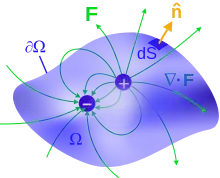 Volume Ω and its closed boundary ∂Ω, containing (respectively enclosing) a source (+) and sink (−) of a vector field F. Here, F could be the E field with source electric charges, but not the B field, which has no magnetic charges as shown. The outward unit normal is n.