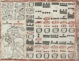 There are different representations of zero in the Dresden Codex, as can be seen at page 43b (which is concerned with the synodic cycle of Mars).[2] It has been suggested that these pointed, oblong "shell" representations are calligraphic variants of the PET logogram, approximately meaning "circular" or "rounded", and perhaps the basis of a derived noun meaning "totality" or "grouping", such that the representations may be an appropriate marker for a number position which has reached its totality.[3]