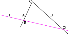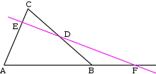 In Euclidean geometry, Menelaus's theorem, named for Menelaus of Alexandria, is a proposition about triangles in plane geometry. Suppose we have a triangle △ABC, and a transversal line that crosses BC, AC, AB at points D, E, F respectively, with D, E, F distinct from A, B, C. A weak version of the theorem states that