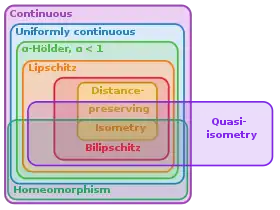 A quasi-isometry is a map that preserves the "large-scale structure" of a metric space. Quasi-isometries need not be continuous. For example, and its subspace are quasi-isometric, even though one is connected and the other is discrete. The equivalence relation of quasi-isometry is important in geometric group theory: the Švarc–Milnor lemma states that all spaces on which a group acts geometrically are quasi-isometric.[15]
