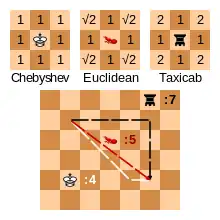 This distance does not have an easy explanation in terms of paths in the plane, but it still satisfies the metric space axioms. It can be thought of similarly to the number of moves a king would have to make on a chess board to travel from one point to another on the given space.