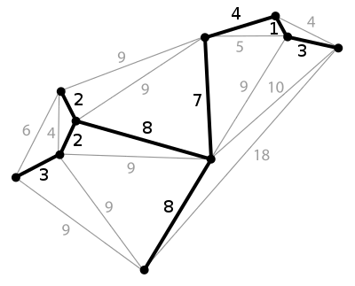 A minimum spanning tree (MST) or minimum weight spanning tree is a subset of the edges of a connected, edge-weighted undirected graph that connects all the vertices together, without any cycles and with the minimum possible total edge weight.[1] That is, it is a spanning tree whose sum of edge weights is as small as possible.[2] More generally, any edge-weighted undirected graph (not necessarily connected) has a minimum spanning forest, which is a union of the minimum spanning trees for its connected components.