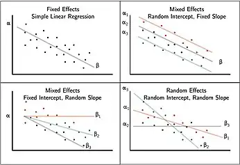 A key component of the mixed model is the incorporation of random effects with the fixed effect. Fixed effects are often fitted to represent the underlying model. In Linear mixed models, the true regression of the population is linear, β. The fixed data is fitted at the highest level. Random effects introduce statistical variability at different levels of the data hierarchy. These account for the unmeasured sources of variance that affect certain groups in the data. For example, the differences between student 1 and student 2 in the same class, or the differences between class 1 and class 2 in the same school. [6][7][8]