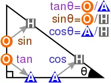 Another method is to expand the letters into a sentence, such as "Some Old Horses Chew Apples Happily Throughout Old Age", "Some Old Hippy Caught Another Hippy Tripping On Acid", or "Studying Our Homework Can Always Help To Obtain Achievement". The order may be switched, as in "Tommy On A Ship Of His Caught A Herring" (tangent, sine, cosine) or "The Old Army Colonel And His Son Often Hiccup" (tangent, cosine, sine) or "Come And Have Some Oranges Help To Overcome Amnesia" (cosine, sine, tangent).[2][3] Communities in Chinese circles may choose to remember it as TOA-CAH-SOH, which also means 'big-footed woman' (Chinese: 大腳嫂; Pe̍h-ōe-jī: tōa-kha-só) in Hokkien.