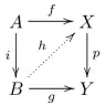 - Lifting: acyclic cofibrations have the left lifting property with respect to fibrations, and cofibrations have the left lifting property with respect to acyclic fibrations. Explicitly, if the outer square of the following diagram commutes, where i is a cofibration and p is a fibration, and i or p is acyclic, then there exists h completing the diagram.