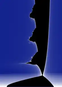 ![]() Multibrot rendered with exponent on vertical axis along a plane angled 45-degrees between the real and imaginary axes. |