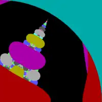 Each of the examples of various powers d shown below is plotted to the same scale. Values of c belonging to the set are black. Values of c that have unbounded value under recursion, and thus do not belong in the set, are plotted in different colours, that show as contours, depending on the number of recursions that caused a value to exceed a fixed magnitude in the Escape Time algorithm.