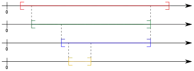 Put into words, property 1 means, that the intervals are nested according to their index. The second property formalizes the notion, that interval sizes get arbitrarily small; meaning, that for an arbitrary constant one can always find an interval (with index ) with a length strictly smaller than that number . It is also worth noting that property 1 immediately implies that every interval with an index must also have a length .