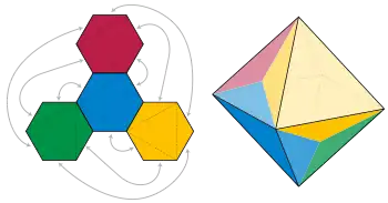 Many different nets can exist for a given polyhedron, depending on the choices of which edges are joined and which are separated. The edges that are cut from a convex polyhedron to form a net must form a spanning tree of the polyhedron, but cutting some spanning trees may cause the polyhedron to self-overlap when unfolded, rather than forming a net.[5] Conversely, a given net may fold into more than one different convex polyhedron, depending on the angles at which its edges are folded and the choice of which edges to glue together.[6] If a net is given together with a pattern for gluing its edges together, such that each vertex of the resulting shape has positive angular defect and such that the sum of these defects is exactly 4π, then there necessarily exists exactly one polyhedron that can be folded from it; this is Alexandrov's uniqueness theorem. However, the polyhedron formed in this way may have different faces than the ones specified as part of the net: some of the net polygons may have folds across them, and some of the edges between net polygons may remain unfolded. Additionally, the same net may have multiple valid gluing patterns, leading to different folded polyhedra.[7]