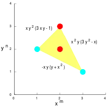Another, perhaps more intuitive way to view this process is this : consider a rubber band surrounding all the points P0, ..., Pn. Stretch the band upwards, such that the band is stuck on its lower side by some of the points (the points act like nails, partially hammered into the xy plane). The vertices of the Newton polygon are exactly those points.