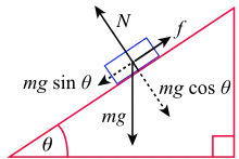 A common visual representation of forces acting in concert is the free body diagram, which schematically portrays a body of interest and the forces applied to it by outside influences.[22] For example, a free body diagram of a block sitting upon an inclined plane can illustrate the combination of gravitational force, "normal" force, friction, and string tension.[note 4]