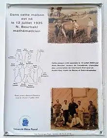 The group's official founding conference was held in Besse-en-Chandesse, from 10 to 17 July 1935.[50][51] At the time of the official founding, the membership consisted of the six attendees at the first lunch of 10 December 1934, together with Coulomb, Ehresmann and Mandelbrojt. On 16 July, the members took a walk to alleviate the boredom of unproductive proceedings. During the malaise, some decided to skinny-dip in the nearby Lac Pavin, repeatedly yelling "Bourbaki!"[52] At the close of the first official conference, the group renamed itself "Bourbaki", in reference to the general and prank as recalled by Weil and others.[45][lower-alpha 5] During 1935, the group also resolved to establish the mathematical personhood of their collective pseudonym by getting an article published under its name.[50][54] A first name had to be decided; a full name was required for publication of any article. To this end, René de Possel's wife Eveline "baptized" the pseudonym with the first name of Nicolas, becoming Bourbaki's "godmother".[50][55][56][57] This allowed for the publication of a second article with material attributed to Bourbaki, this time under "his" own name.[58] Henri Cartan's father Élie Cartan, also a mathematician and supportive of the group, presented the article to the publishers, who accepted it.[54]
