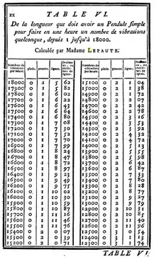 - Tables of the length a pendulum must have for a given number of oscillations per hour, in Jean-André Lepaute's Treatise of Clockmaking, Paris, augmented edition of 1767, first edited 1755