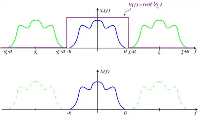 Spectrum, , of a properly sampled bandlimited signal (blue) and the adjacent DTFT images (green) that do not overlap. A brick-wall low-pass filter, , removes the images, leaves the original spectrum, , and recovers the original signal from its samples.