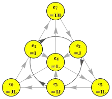 A convenient mnemonic for remembering the products of unit octonions is given by the diagram, which represents the multiplication table of Cayley and Graves.[5][10] This diagram with seven points and seven lines (the circle through 1, 2, and 3 is considered a line) is called the Fano plane. The lines are directional. The seven points correspond to the seven standard basis elements of Im(O) (see definition below). Each pair of distinct points lies on a unique line and each line runs through exactly three points.