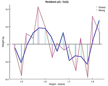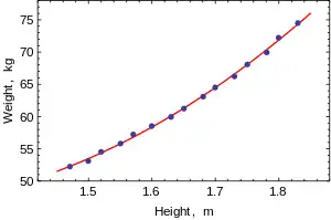 This example also demonstrates that coefficients determined by these calculations are sensitive to how the data is prepared. The heights were originally given rounded to the nearest inch and have been converted and rounded to the nearest centimetre. Since the conversion factor is one inch to 2.54 cm this is not an exact conversion. The original inches can be recovered by Round(x/0.0254) and then re-converted to metric without rounding. If this is done the results become: