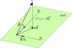 where · is the standard L2 norm in the n-dimensional Euclidean space Rn. The predicted quantity is just a certain linear combination of the vectors of regressors. Thus, the residual vector y will have the smallest length when y is projected orthogonally onto the linear subspace spanned by the columns of X. The OLS estimator in this case can be interpreted as the coefficients of vector decomposition of ^y = Py along the basis of X.