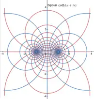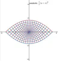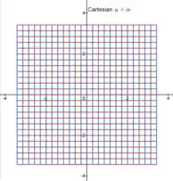 A simple method for generating orthogonal coordinates systems in two dimensions is by a conformal mapping of a standard two-dimensional grid of Cartesian coordinates (x, y). A complex number z = x + iy can be formed from the real coordinates x and y, where i represents the imaginary unit. Any holomorphic function w = f(z) with non-zero complex derivative will produce a conformal mapping; if the resulting complex number is written w = u + iv, then the curves of constant u and v intersect at right angles, just as the original lines of constant x and y did.