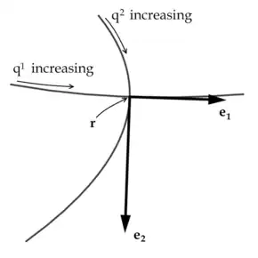 where r is some point and qi is the coordinate for which the basis vector is extracted. In other words, a curve is obtained by fixing all but one coordinate; the unfixed coordinate is varied as in a parametric curve, and the derivative of the curve with respect to the parameter (the varying coordinate) is the basis vector for that coordinate.