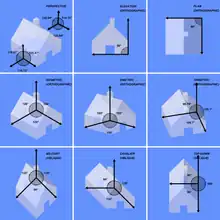 Three sub-types of orthographic projection are isometric projection, dimetric projection, and trimetric projection, depending on the exact angle at which the view deviates from the orthogonal.[2][4] Typically in axonometric drawing, as in other types of pictorials, one axis of space is shown to be vertical.