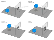 The term orthographic sometimes means a technique in multiview projection in which principal axes or the planes of the subject are also parallel with the projection plane to create the primary views.[2] If the principal planes or axes of an object in an orthographic projection are not parallel with the projection plane, the depiction is called axonometric or an auxiliary views. (Axonometric projection is synonymous with parallel projection.) Sub-types of primary views include plans, elevations, and sections; sub-types of auxiliary views include isometric, dimetric, and trimetric projections.