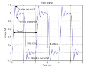 A closely related phenomenon is ringing, when, following overshoot, a signal then falls below its steady-state value, and then may bounce back above, taking some time to settle close to its steady-state value; this latter time is called the settle time.