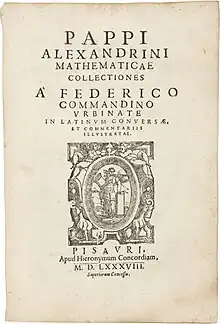 - Pappi Alexandrini Mathematicae collectiones. A Federico Commandino Vrbinatae in latinum conuersae, & commentarijs illustratae (in Russian). apud Franciscum de Franciscis Senensem. 1589.