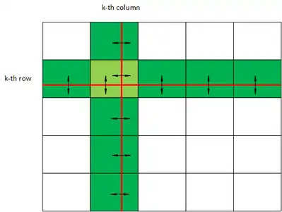 Additionally each process needs a part of the k-th row and the k-th column of the matrix. The element holds a process in the same row and the element holds a process in the same column as the process that wants to compute . Each process that calculated a part of the k-th row in the matrix has to send this part to all processes in its column. Each process that calculated a part of the k-th column in the matrix has to send this part to all processes in its row. All this processes have to do a one-to-all-broadcast operation along the row or the column. The data dependencies are illustrated in the image below.